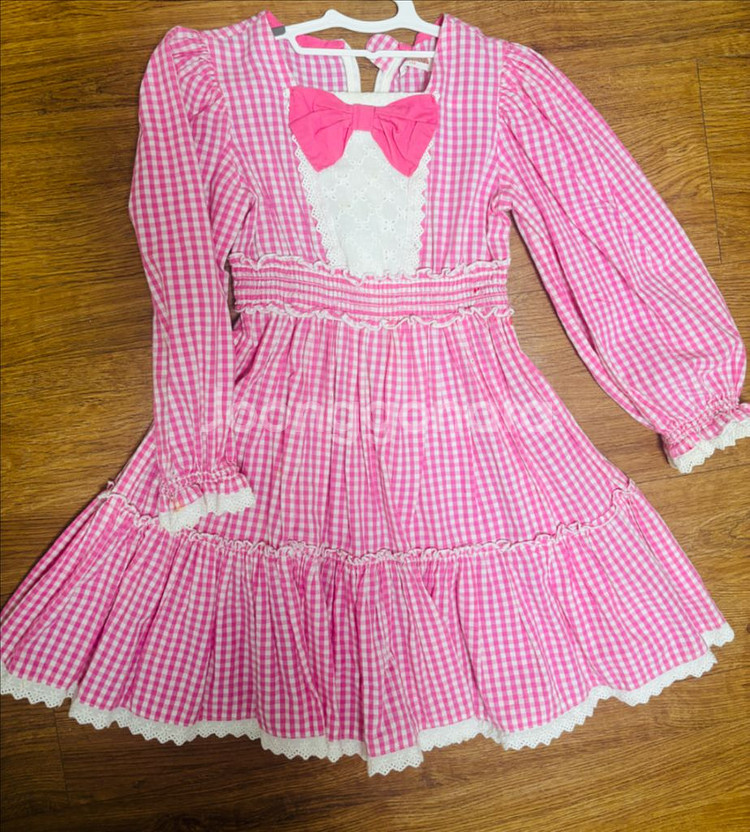 핑크 체크 패턴에 귀여운 리본, 소매와 밑단에 레이스 장식이 있어서 입으면 공주님 되요 핑크 좋아하는시기에 너무 좋아했어요^^ 얇은 면이라 초여름, 봄 입을 수 있어요 사이즈 110, 얼룩있어 표시하여 저렴히 올립니다 주름진 부분 뒷쪽 부분 얼룩이라 잘 안보이긴해요 반택가능!