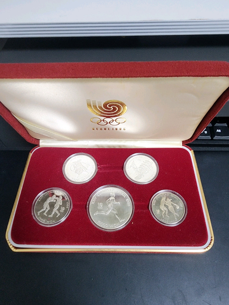 최상급으로 보관된 88올림픽 기념주화 5종 1차입니다 * 제원 1) 만원권: 은 92.5%, 구리 7.5% / 33.62g 2) 오천원권: 은 92.5%, 구리 7.5% / 16.81g 3) 오천원권: 은 92.5%, 구리 7.5% / 16.81g 4) 이천원권: 순니켈 / 17g 5) 천원권: 구리 75%, 니켈25% / 12g 직거래/택배 모두 가능합니다 * 개인간 거래로 환불 정중히 사양합니다 😭