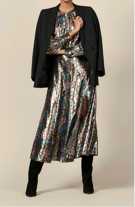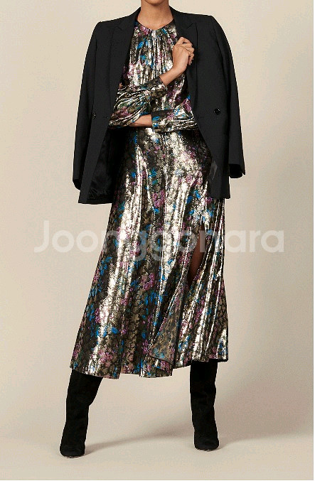 우아하고 화려한 산드로 SANDRO 글리터 플로랄 원피스 정가 295유로, 한화 약 51만원인 제품으로 2021년 구입 소재 레이온 80, 금속섬유 20% 택 사이즈 36인데 넉넉하게 나와 실측 가슴 반품 45, 허리 35, 기장 125cm 왼쪽 하단 54cm 정도의 슬릿 있어 활동 편함