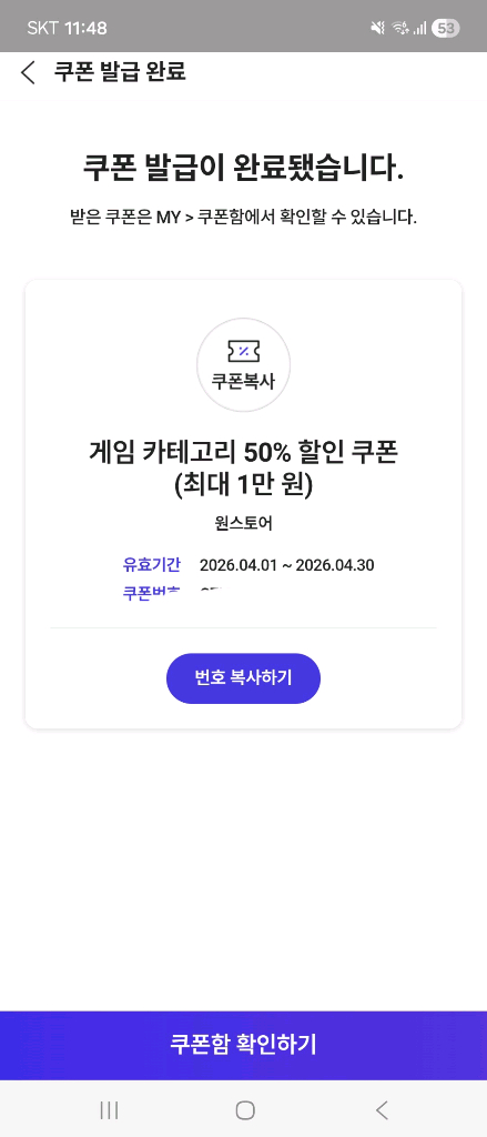 원스토어 50퍼(최대1만원) 쿠폰 팔아요