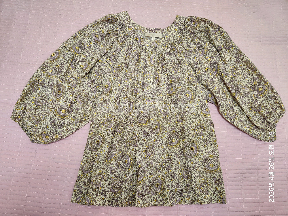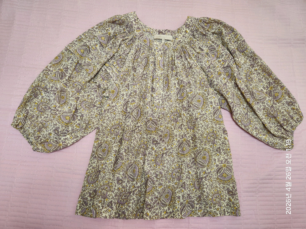 화사한 페이즐리 패턴이 돋보이는 톤다운된 보라색 비슷한 바네사브루노 블라우스예요 부드러운 레이온과 실크 혼방 소재로 촉감이 부드럽고 넘 편안하게 입을수 있어요. 여유로운 품과 볼륨감 있는 소매 디자인이 매력적이에요 여성스럽고 고급스런 분위기로 요즘 입기 딱 좋은 블라우스입니다. 저랑 안 어울려서 몇번 입지도 못하고 판매합니다. 손상없고 사용감 전혀 없습니다.