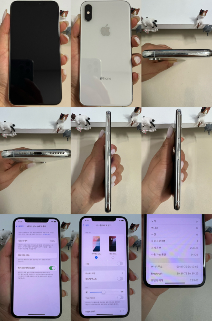 아이폰XS 입니다 256G 실버색상이구여 외관 잔기스 살짝 있구요 액정은 기스 없고 잔상없습니다 배터리는 새걸로 교체해서 성능100%나오구여 교체후 미사용중입니다 배터리셀만 사설교체며 저가제품이 아닌 최상급만 사용하고 케이블은 정품 그대로 사용하므로써 **알수없는 부품**이 아닌 정품이랑 똑같이 성능표시 잘 되구여 배터리도 오래갑니다 사용해보시면 오래가는게 느껴지실껍니다 정품이랑 성능 용량 같은 제품입니다 카메라,페이스아이디,트루톤, 무선충전 등등 모든기능 정상작동 합니다 유심넣으면 바로 사용가능하구여 정상해지며 선택약정 가능합니다 (영상첨부합니다 확인부탁드립니다)