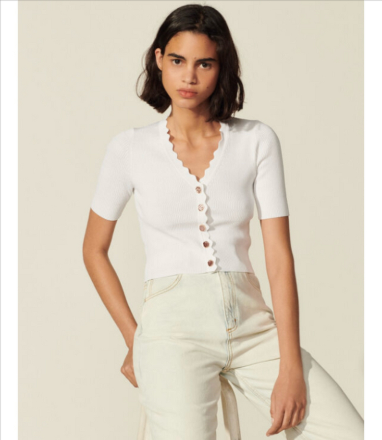 산드로 골지 니트 가디건 2사이즈 판매합니다. 흰색의 브이넥 디자인으로, 물결 모양 마감 디테일이 돋보입니다 청바지, 슬랙스, 스커트 등등 어떤 아이템과 매치하셔도 잘 어울려요 신축성 좋아 편해요 사용감없이 깨끗한 상태예요 일반3500원 반값2000원 입니다