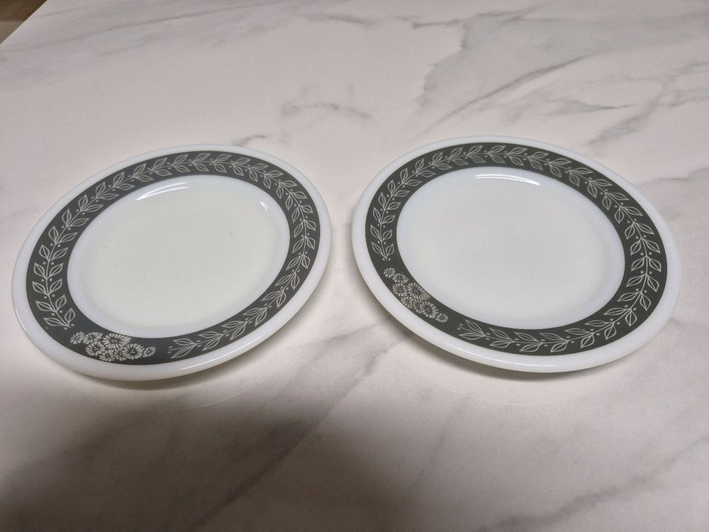 빈티지 파이렉스 코닝웨어 라우렐 월계수 밴드 접시 2개 세트입니다. 뽀얀 우윳빛에 월계수 밴드 디자인이 고급스러워요. 앤틱 제품 특성상 미세한 기스 있을 수 있습니다. 사용감있는 접시를 구매후 보관상태 입니다 사진으로 확인하시고 빈티지 특성상 감안하시고 구매해주세요^^ 2p 일괄판매 합니다 지름 17.5 센티