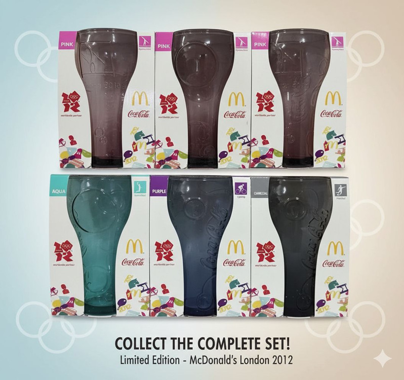 2012년 런던 올림픽 기념 코카콜라 유리컵 굿즈입니다. 미개봉 새상품이며 런던올림픽 기념하여 맥도날드와 코카콜라사 당시 콜라보하며 나왔던 유리컵입니다. 핑크, 아쿠아, 퍼플, 차콜 4가지 종류입니다. 판매는 일괄로 합니다! 언제든지 문의주세요!
