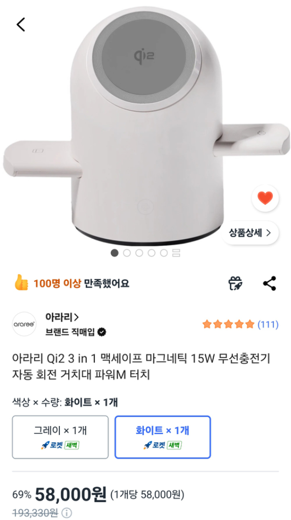 스마트폰, 스마트워치, 이어폰까지 한 번에 충전할 수 있는 아라리 Qi2 맥세이프 3in1 무선충전기예요 최대 15W 고속 충전을 지원하며, 자동 회전 거치대 기능으로 편리하게 사용할 수 있어요 애플워치와 갤럭시워치 모두 충전 가능하며, 깔끔한 화이트 색상으로 어떤 공간에도 잘 어울려요 기종 걱정 없이 간편하게 충전하고 싶은 분들께 추천드려요