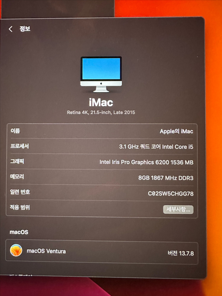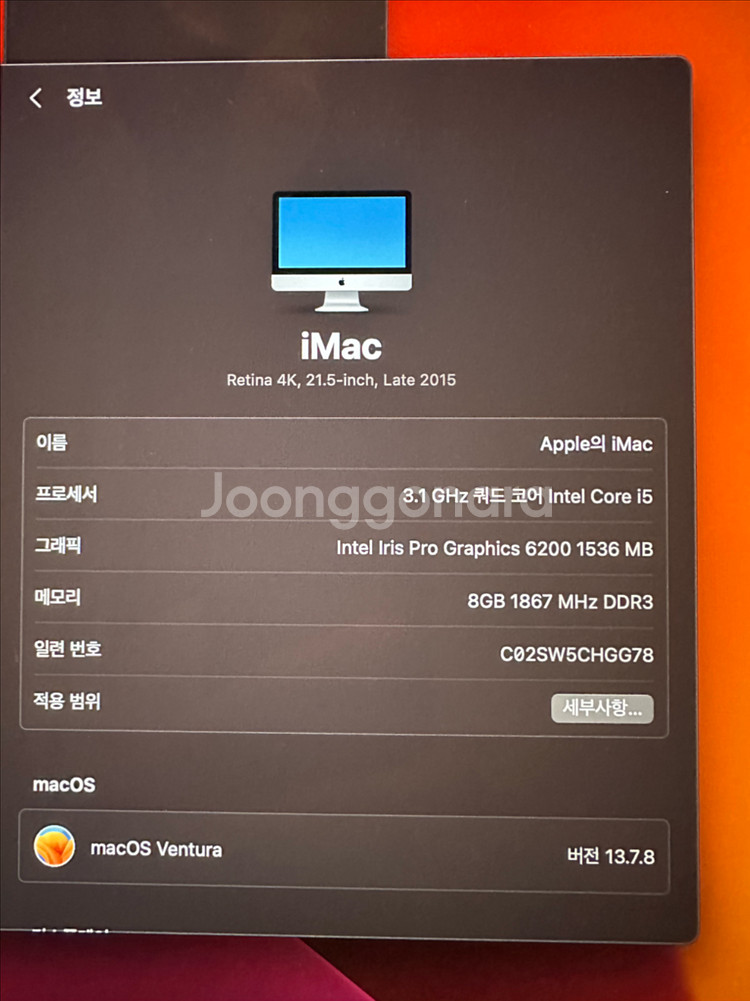 아이맥2015 4K 21.5인치 입니다. 매직마우스2,매직키보드2 포함입니다. 라이트닝8핀충전 I5 3.1ghz 8GB DDR3 Intel Iris Pro Graphics 6200 1536MB SSD 500G 화면테두리 핑크빛 현상 있습니다. 4K 이상 인텔아이맥 종특으로 4K 이상 인텔아이맥 모든기종에 다 나타나는 현상인줄 압니다. 책상에 고정된 상태로 사용해서 외부 상태도 양호합니다. 마우스,키보드는 손으로 만지는 거라 생활감 있고 키보드는 스페이스키는 키캡이 살짝 들어가 있고 방향키 오른쪽 키캡은 오른쪽부분이 살짝 들렸습니다. 사용하는데 불편함 없고 모든키 정상 인식됩니다. 키시트는 새거 입니다. 지금 내부 청소 및 써멀구리스 재도포 완료했습니다. 액정은 테이프로 고정해놨고 액정 붙이는 재치테이프 챙겨드립니다. 테이프 붙이는건 힘들지 않을꺼에요. 혹시나 해서 붙이지 않은겁니다. 내부청소,써멀구리스재도포,코인건전지도 교체했고 SSD로 교체해서 한동안은 쾌적하게 쓸만할겁니다. 박스는 재치박스는 아니지만 같은라인 박스에 넣어놨습니다. 들고가기 편하실겁니다. 구매후 반품,환불 불가니 신중히 생각후 구매 바랍니다. 시간 맞으면 가져다 드릴게요. 몬테레이 초기화 상태입니다.