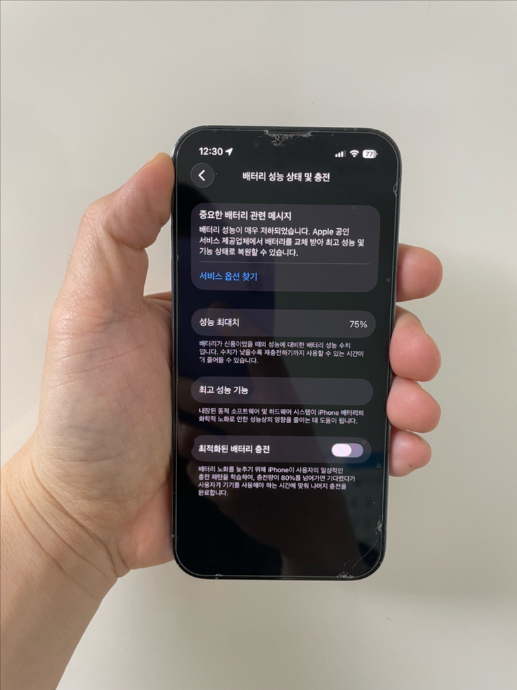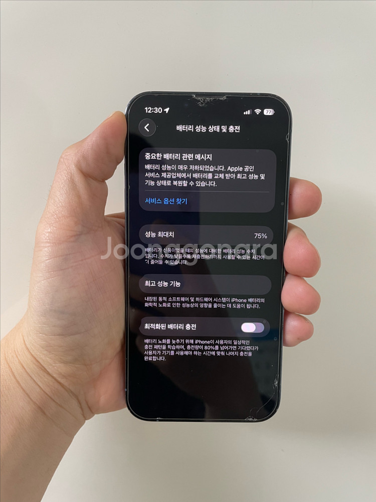 개인정보(거래정보)를 주고받는 행위는 사기에 노출될 수 있으므로 즉시 중고나라로 신고해 주세요모델명아이폰 13 프로 128GB컬러시에라 블루아이폰 뒤 파손 앞은 파손은 없는데 액정에 멍있어요 사용중인 보호필름 좀 금가고 깨져있네요 모든기능 정상작동해요 배터리 75% 용량 128 GB