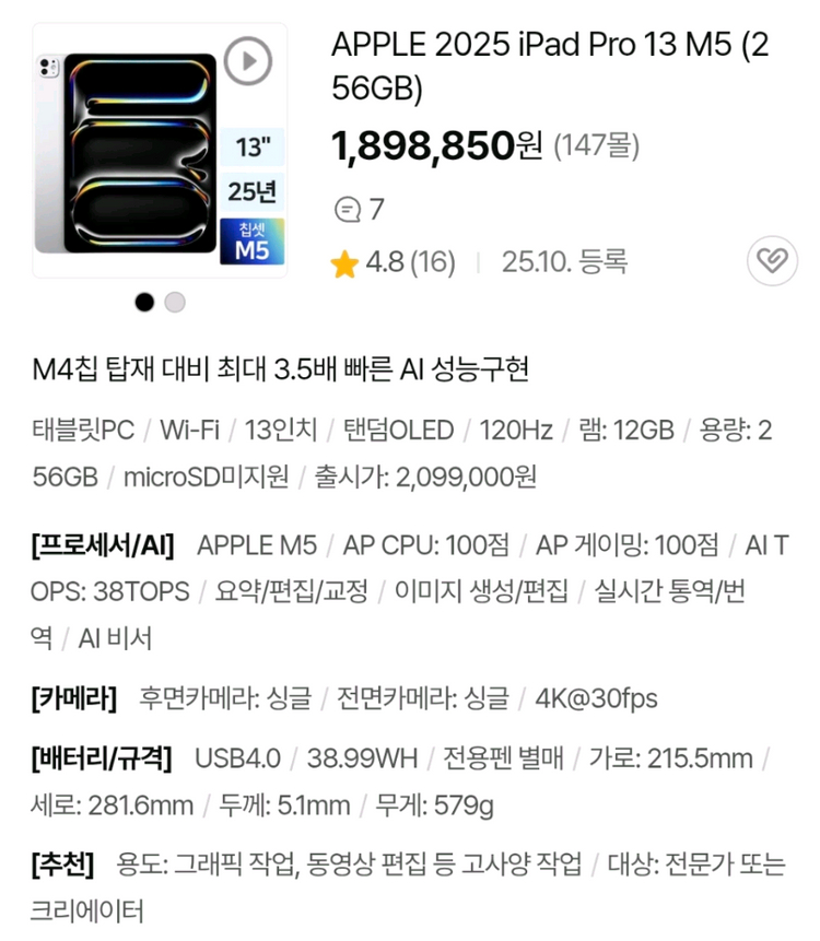 미개봉 아이패드 프로 13형 M5 wifi 256gb 실버 MDYK4KH/A 1대 블랙 MDWK4KH/A 1대 대당 165만원 / 네고 불가 기재한 가격에만 판매합니다 / 불필요한 문의 사절 사진과 같이 미개봉 새제품 상태 입니다 직거래 인천 송.도 입니다 (그외 경기도나 서울은 일정 조율후 가능) olo 753l 둘444