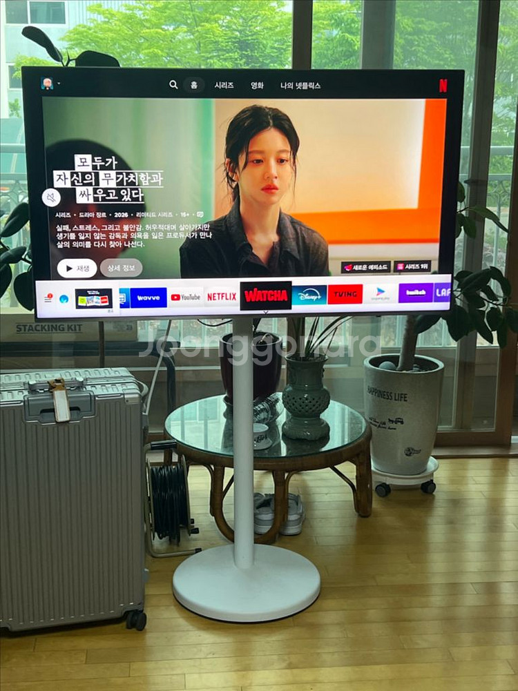 삼성 QLED 55인치 4K 스마트TV + 모블랩스 삼탠바이미 거치대 판매 < TV > -모델명: QN55Q6FNKF -QLED 55인치 4K -유튜브, 넷플릭스, 왓챠, 티빙, 웨이브, 디즈니플러스, 쿠팡플레이 등 웬만한 OTT 다 가능합니다(와이파이만 연결하면 이용 가능) -19년도 구매했습니다 -작동 잘 되고 하자 없습니다 < 모블랩스 거치대 > -옵션포함 26만원 상당의 고급 거치대(사진 참조) -옵션: 플스 선반+정리함+4미터 4구 멀티탭 -사진 보시면 정리함 앞쪽으로 플스5거치할 수 있습니다 -비싼만큼 튼튼하고 바퀴 부드럽게 잘 굴러갑니다 tv와 거치대 함께 판매합니다
