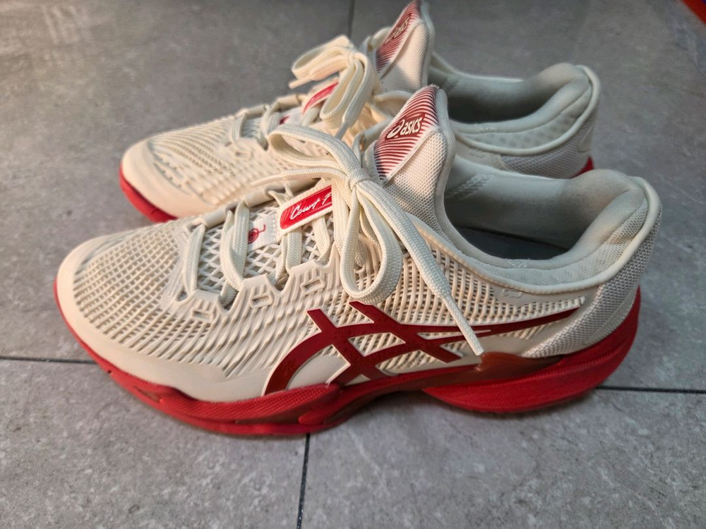 아식스 코트 FF 테니스화 크림/레드 색상이에요 사진에서 보이는 것처럼 상태 좋습니다.