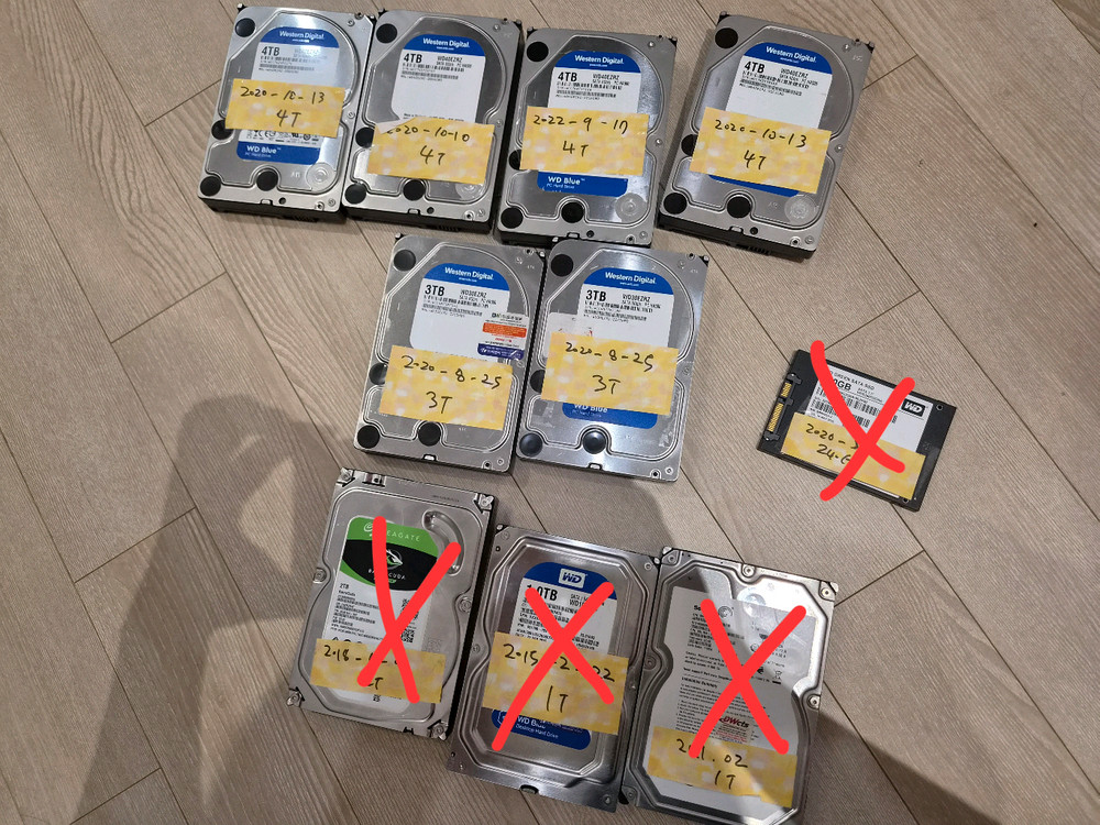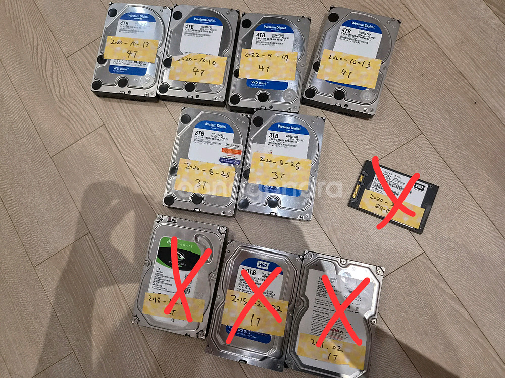 다양한 용량의 HDD 하드디스크 판매해요 WD Blue 4TB 4개, WD Blue 3TB 2개, WD 1TB 1개, 씨게이트 바라쿠다 1TB 1개, WD SSD 240GB 1개 구성이에요 사진에서 용량과 제조일자 확인 가능해요 대용량 저장 공간이 필요하신 분들께 추천드려요 HDD 2022년 -4TB 9 2020년 -4TB 8 -3TB 7 2018년 -2TB 씨게이트 3 (판매완료) 2015년 -1TB 2 (판매완료) 2011년 -1TB 씨게이트 1 (판매완료) ssd 2020년 240g 2만 (판매완료)