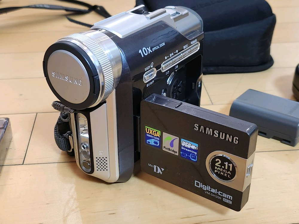 삼성 VM-DH200 6mm 디지털 비디오 캠코더 카메라 핸디캠 입니다. 오랜 세월에도 약간 사용감 제외 외관 매우 깨끗 한 편이고 촬영 재생 이상없습니다. 상세 사진 참조 하시기 바랍니다. 예전에 촬영해 놓으신 6mm 테이프 보시거나 편집하실 때 아주 유용합니다. 배터리는 20여년의 세월에 완전 방전되어 전원 아답터 220V로 연결 사용 가능합니다. 택배 시, 택배비 4000원 추가됩니다.