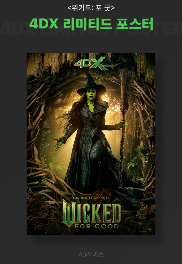 위키드 포굿 CGV 4DX 포스터 씨지브이 포디엑스 엘파바 특별관 영화 특전 굿즈 양도 판매 미개봉 새 상품⭕️ 운미포 0.5 편하게 연락 주세요 우체국 택배 +4,000원 편의점 일반 택배 수도권 +3,400원, 타권 +3,900원 GS25 반값 택배, CU 알뜰 택배 +1,900원 상품 무게, 크기 따라서 변동 가능성⭕️