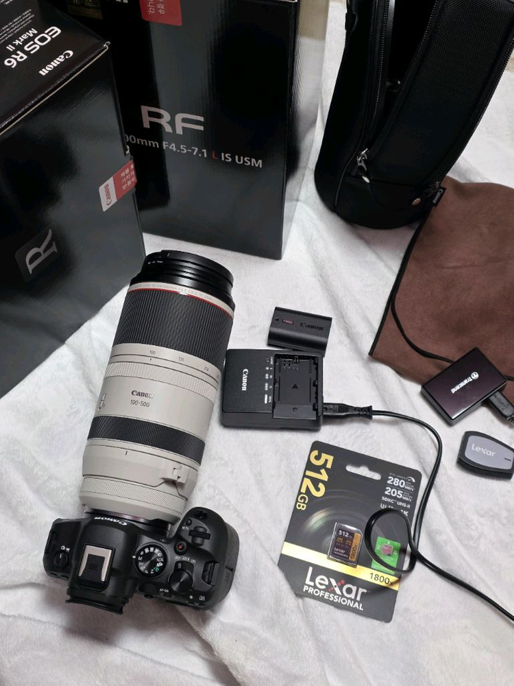 약간의 에눌 가능! 찔러봐주세요 ⭐️ 사용하려고 3월 말에 사서 집에서만 몇번 찍어본게 다라 100컷 미만 입니다 밖에 가지고 나간적 없고 깨끗해요 🥲 생각보다 손이 잘 안가게 되어서 판매해요 캐논 카메라 r6mark2 + RF100-500 + RF35mm F1.8 박스 풀셋이고 리더기랑 렉사 메모리 256,512기가 두개 있어요, 배터리 2개, c타입 충전 배터리까지 총 3개 있습니다 100 500 렌즈에 구매시 uv필터 장착해둔 상태입니다 35mm도 필터 및 후드 구매후 장착 되어있습니다 받으시면 바로 사용 가능한 상태로 구성되어있습니다 가격이 있는만큼 직거래 우선으로 할게요 🥲 직거래 지역은 충북 음성군 대소면입니다