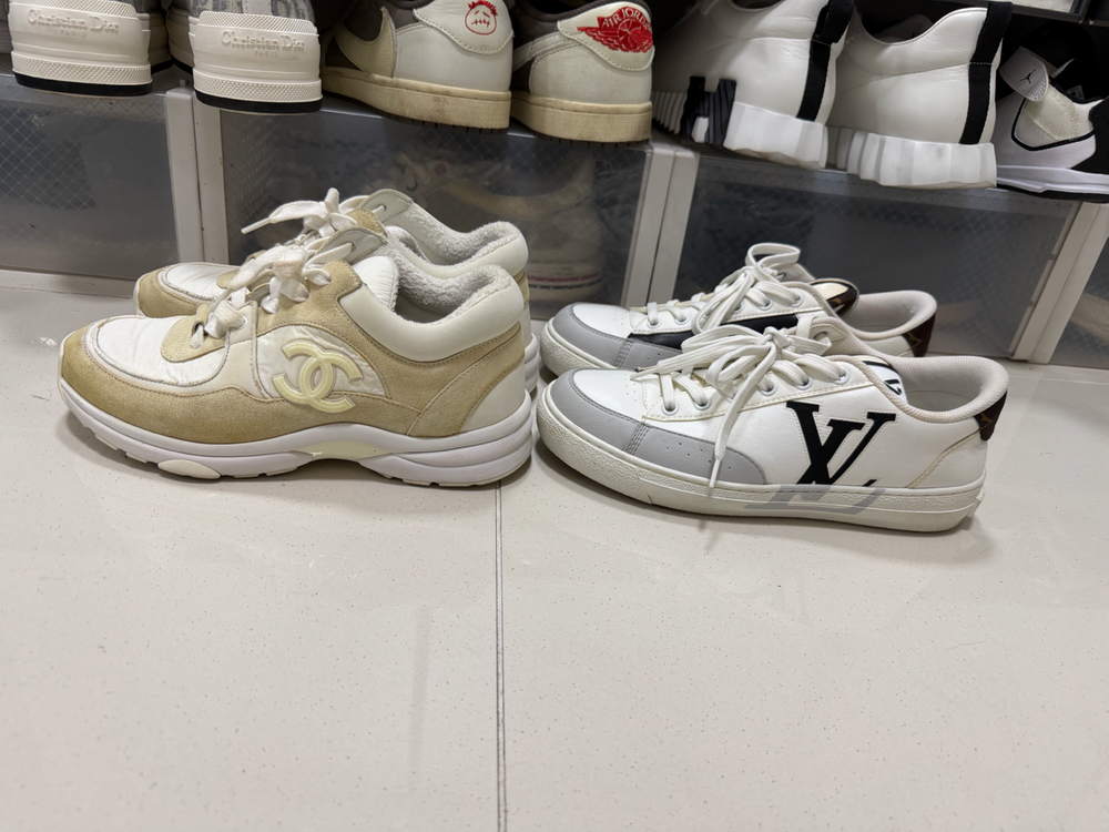1.정품 샤넬 CC 로고 스웨이드 스니커즈 베이지 색상 399000원판매 아무옷에나 잘 어울리고 너무 이쁜데 사용감이 사진처럼 많아서 급처합니다 세탁비도 뺏어요~~ 200만원정도 구매한거같아여 2.정품 루이비통 찰리스니커즈 가죽이고 뒤에도 이쁘고 옆도 이쁜데 사진처럼 사용감있어요 36만원판매 160정도에 구매한거같아요 둘다 정품 신발단품 37사이즈 235가 잘맞음 전 230~240사이신어요 두개다 구매시 10만원할인 76➡️66만원에 급처합니다