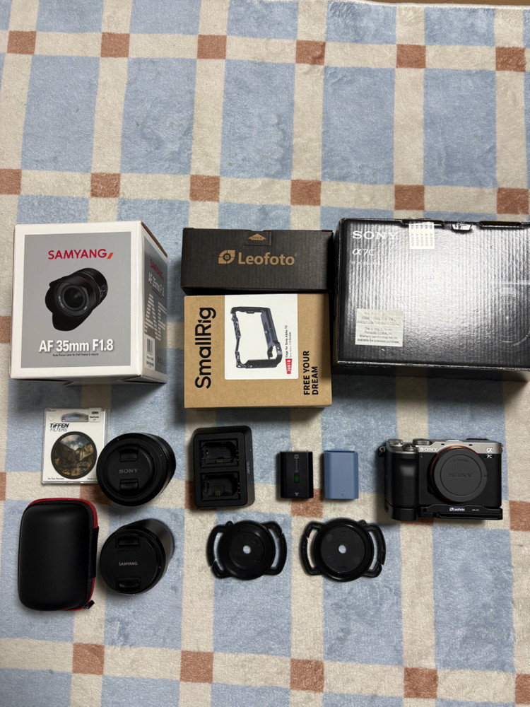 소니 A7C 풀프레임 민트급 판매합니다. 취미로 해보려고 크롭에서 플프레임 왔는데 아이들과 함께하기에는 너무 어려워서 정리합니다 - 바디 세트 A7C 풀박스 + 6818 컷으로 민트급 : 찍힘/기스 없음 구매하자마자 액정필름 부착 상태로 LCD상태도 굿 정품 배터리 + 스몰리그 배터리 : 총 2개 ISDT 배터리 충전 독(모바일 연동 가능) 스몰리그 풀케이지 레오포토 L플레이트 - 삼양 35.8 풀박스입니다, 렌즈캡이 없어져서 소니캡으로 드립니다. 35mm화각으로 실내/실외 모두 커버합니다. 생활기스 살짝 있지만 A급입니다. UV 필터 장착되어 있습니다. - 자이즈 55.8 아쉽게도 2차구매라 박스는 없습니다. 생활기스 있지만 연식대비 준수합니다. 찍힘이나 눌림같은 큰 상처는 전혀 없습니다. UV 필터 장착 + 블랙미스트 필터 드립니다. 49mm 스틸 후드(알리) 드립니다.