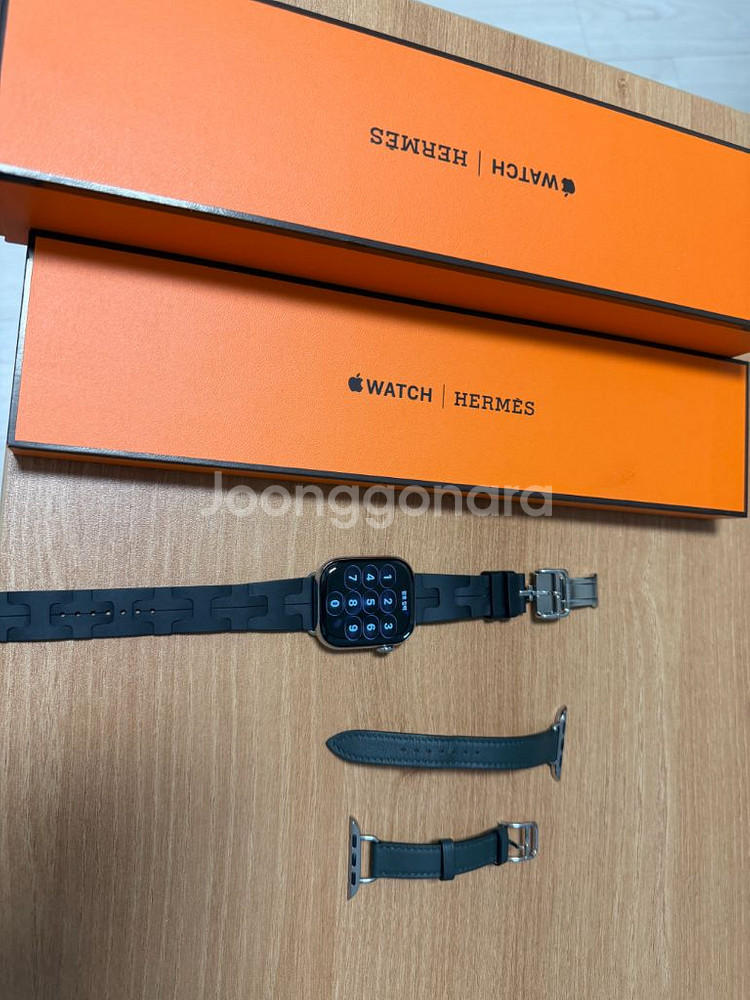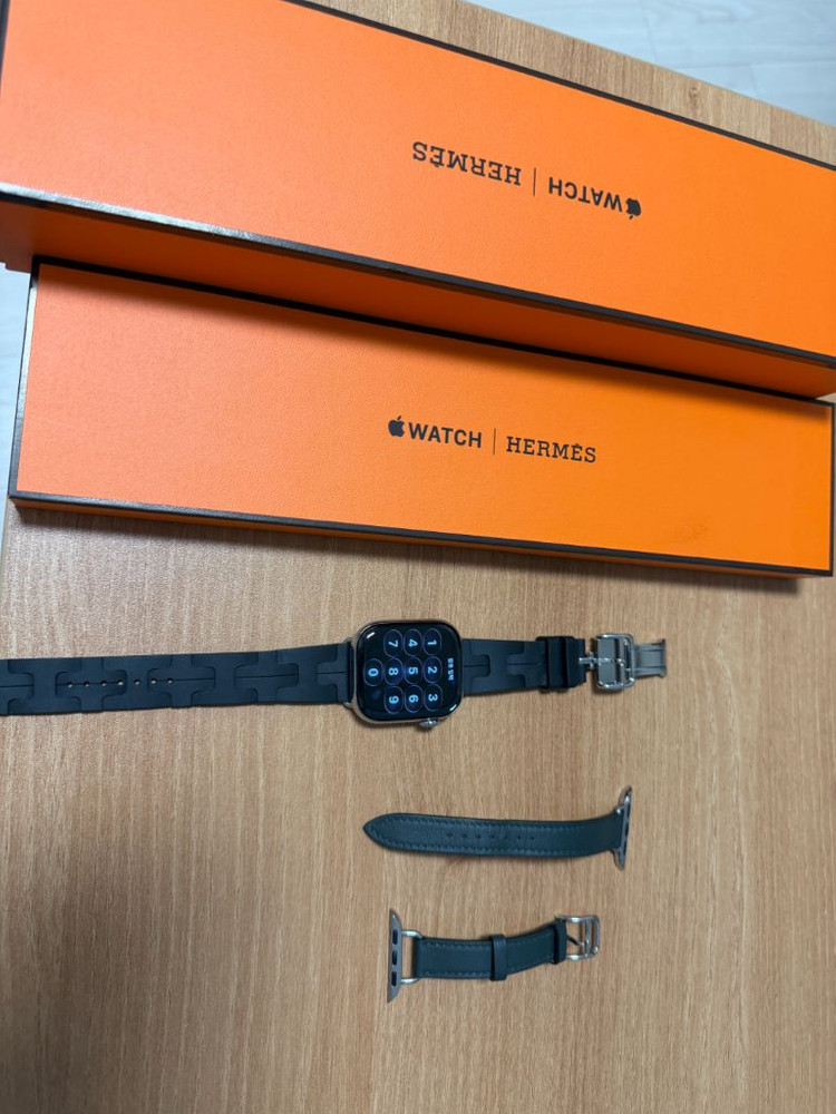 애플워치 11 에르메스 42mm 판매합니다. 올 해 1월 중순 경 구매했습니다. 보증은 27년 1월 12일 만료입니다. 제품 상태는 사진에서 보실 수 있듯 액정 및 본체 모두 기스 전혀 없이 깨끗합니다. 기본 구성은 Kilim 싱글 투어 밴드 구성입니다(1,979,000원). 추가로 구매한 밴드는 에르메스 홈페이지에서 별도 구매한 Attelage 싱글 투어 42mm (659,000원) 입니다. 애플 공홈에서는 더 이상 가죽 밴드를 판매하지 않아 에르메스 홈페이지에서 구매했습니다. 에르메스 밴드는 올 해 3월 말 주문하여 이 역시 상태 깨끗합니다. 그 외 박스 및 구성품 모두 있습니다. 워치와 추가 에르메스 밴드 별도 구매도 가능합니다. 워치 및 kilim 디버클 싱글 투어 밴드 구성 1,200,000원, 에르메스 Attelage 짙은 그린 가죽밴드 350,000원 희망합니다. 두 제품 모두 구매 시 1,500,000원에 판매합니다. 제품 특성상 직거래만 할 예정이며, 서울 및 경기권은 가급적 제가 가져다 드립니다. 문자로 우선 연락 부탁 드립니다(010-9266-1522).