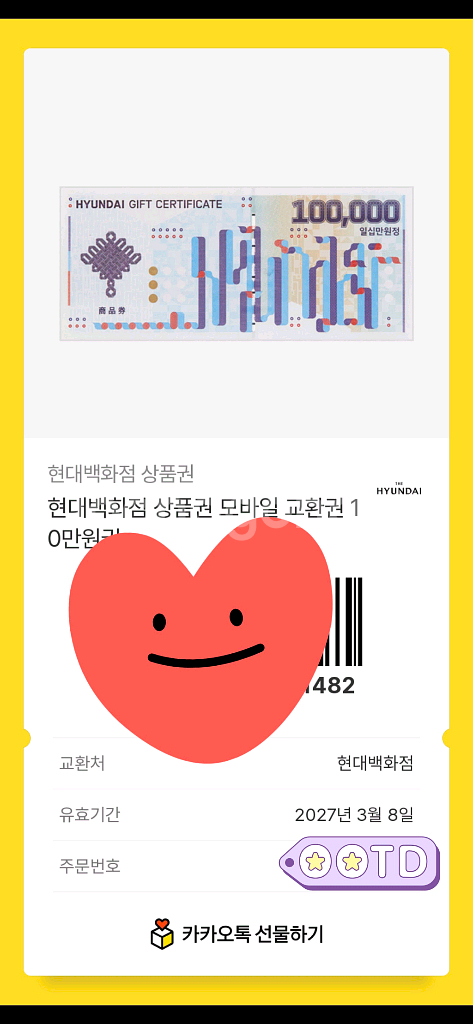 개인정보(거래정보)를 주고받는 행위는 사기에 노출될 수 있으므로 즉시 중고나라로 신고해 주세요유효기간 2027.03.08 이용안내 -본 교환권은 전국 현대백화점 상품권 데스크에서 지류상품권으로 교환 후 사용하실 수 있습니다. 2장 있습니다~ 1장당 93,000원입니다~