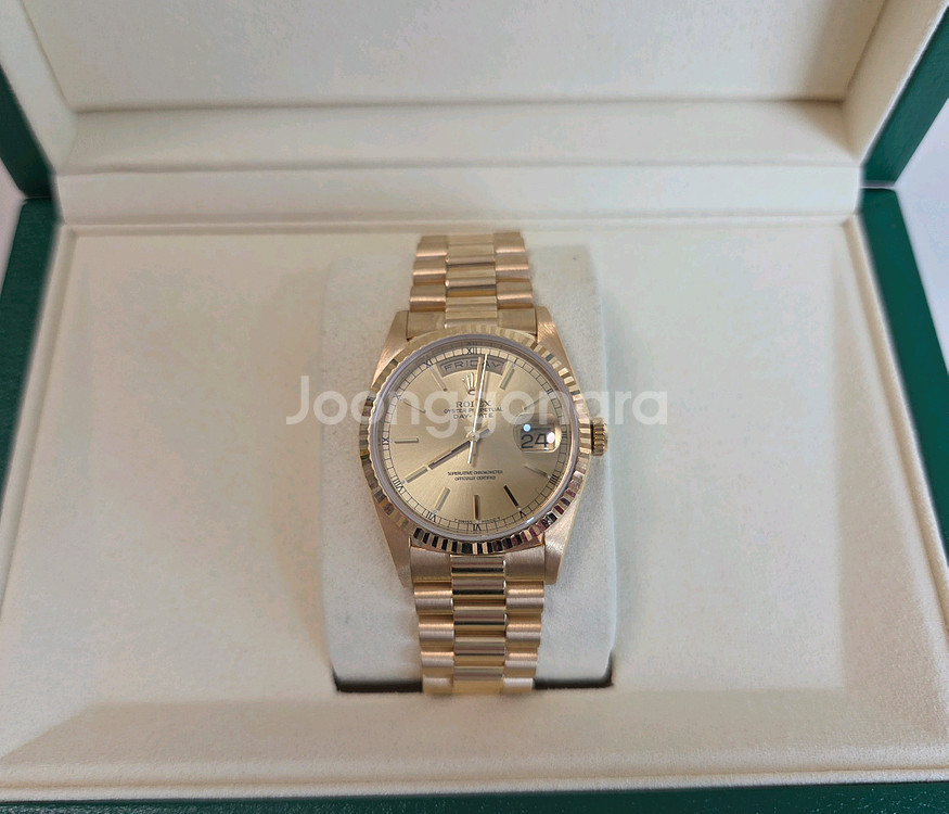 롤렉스 데이데이트 18238 올제치 모델입니다 23코에 손목둘레 19-20센치까지 착용가능합니다 시계 줄 늘어짐 거의 없으며 18038모델과 다르게 3155 무브먼트에 날짜 요일 더블 퀵셋 가능한 모델입니다 몇달전에 명장분께 오버홀 완료하여 바로 착용 가능합니다 E단위 모델로 총무게 37돈정도 합니다 5만원권 거래로 가능하며 거래지역은 조율 가능합니다 금값이 앞으로도 더 오르면 오르지 떨어지지는 않을거기 때문에 실착하시면서 투자용으로 착용해보시는것도 추천드립니다