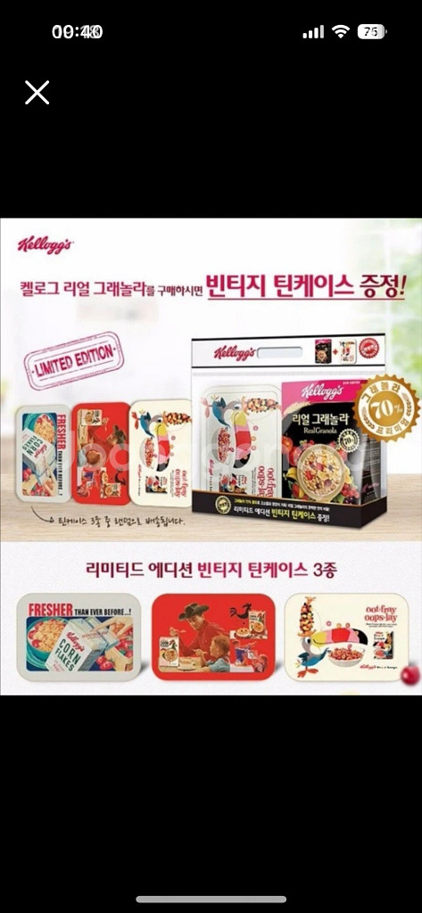 개인정보(거래정보)를 주고받는 행위는 사기에 노출될 수 있으므로 즉시 중고나라로 신고해 주세요한정판 켈로그 틴케이스 새상품 사진순서대로 1번 판매완료 2,3번만 남았습니다 택배비 별도 꼭 하실분만 챗주세요 :)