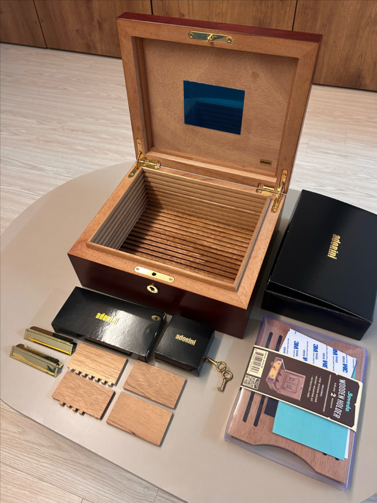아도리니 트라이스트 디럭스 휴미더 (Adorini Humidor Triest Deluxe) 명품 시가 액세서리를 만드는 아도리니에서 출시한 트라이스트 디럭스 시가 휴미더입니다. 시가 종류에 따라 최대 75개의 시가를 보관하실 수 있습니다. 시가 전용 휴미더를 통해 최상의 시가의 맛을 유지하실 수 있습니다. 겉면은 사진과 같이 옻칠이 되어있는데 미세한 생활 기스가 있습니다. 실제로 보면 옻칠에 약간 스크래치가 생긴거라 크게 티는 안납니다. 두군데 정도 사진처럼 약간 찍힌 자국이 있습니다. 사진상 내부 바닥면의 깨진 것 같은 부분은 새제품 구매 당시부터 있었으나 아도리니 해외 본사에 확인 결과 불량은 아니라 사용 상에 지장은 없다고 합니다. 시가 칸막이 중 머리 빗 처럼 생긴 건 바닥 홈에 맞게 꽂는 제품인데 생각보다 약해서 꽂을 때 이빨 몇개가 부서졌습니다. 꽂아서 사용은 가능합니다. 칸막이 위에 꽂아 이름표를 달 수 있게 라벨 클립 2개 제공됩니다. 뚜껑 목재 베니어판에 자석이 내장되어있어 습도계 및 가습기 가 부착 가능합니다. (생각보다 자석이 약해서 보베다 홀더에 포함되어 있던 자석 판을 붙여놨습니다.) 초정밀 아날로그 헤어습도계가 포함되어 있습니다. 사용 시 보정이 필요합니다. 사용 전 재시즈닝 후 사용하셔야 합니다. 택배 발송이 가능하나 제품 특성상 충격이 가해지면 좋지 않기 때문에 거래는 되도록 직거래를 했으면 좋겠습니다. 거리가 멀지 않으면 시간을 잡은 뒤 직접 가져다 드릴 수 있습니다. [구성품] 가습기 온습도계 열쇠2개 아도리니 솔루션 휴미더 음이온 정제수 + 보베다 홀더 60g 짜리 두개 보관용(제품 자체에 포함된 것은 아니지만 서비스로 함께 드립니다) 제품 크기 120 mm x 290 mm x 245 mm 내부 크기 102 mm x 237 mm x 191 mm