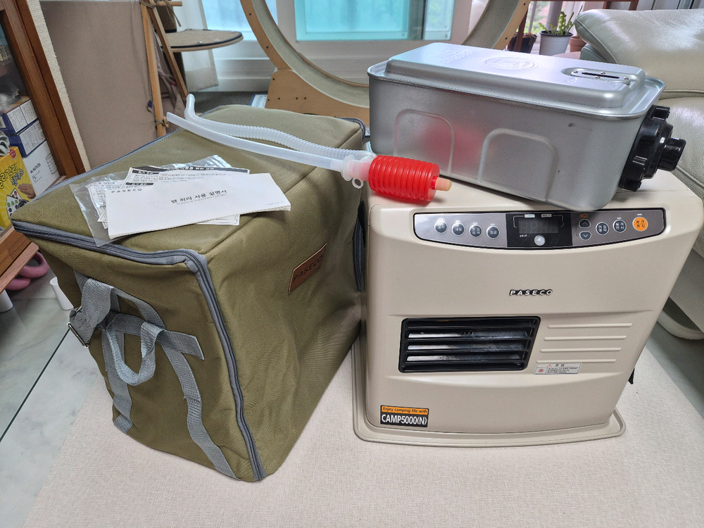 파세코 CAMP-5000N 베이지색 등유난로 판매합니다. 약간의 사용감은 있지만 깨끗한 편입니다. 사진 상에 있는 본체, 가방, 펌프, 사용설명서, 검정색 누유방지마개(체결되어 있음) 포함입니다. 5만원 상당 노스필도 필요하시면 함께 드립니다. 오래 사용하지 않으면 녹색 주유 버튼이 잘 안눌려서 그냥 드립니다. 힘주어서 한번 눌러놓으면 다시 잘 됩니다. 무거운 제품이라 직거래만 합니다. 교환환불은 어렵습니다.