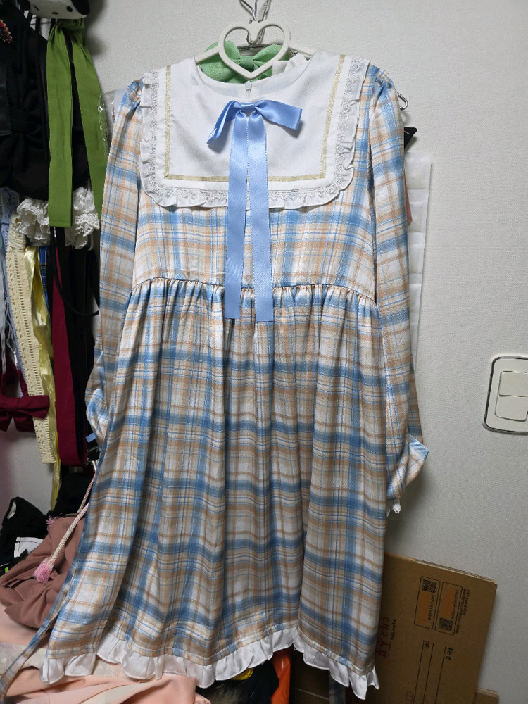 체크 패턴의 귀여운 레이스 원피스 의상이에요. 화이트 칼라와 리본 디테일이 포인트이고, 상태 양호합니다. 봄가을날 착용하기 좋아요! 택 안뗐음, 슈슈 2개+ 리본핀 1개+원피스 구성입니다
