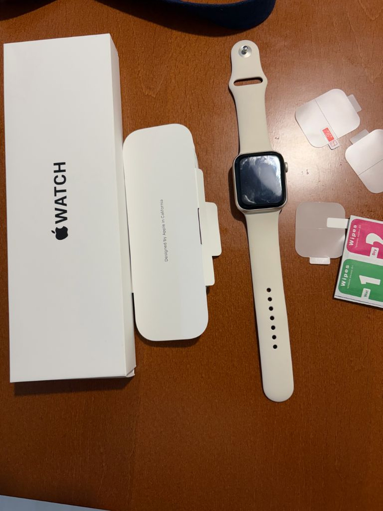 애플워치 SE2 44mm 스타라이트 색상 판매해요 풀박스로 구성품 모두 갖춰져 있어요 사진에서 보시는 것처럼 충전기(미사용) 모두 포함입니다. 깔끔한 디자인으로 어떤 옷에도 잘 어울리는 워치예요. 배터리 98%. 작년말쯤 새거 구입후 필요없어져서 내놓습니다. 액정기스없으며 보호필름 해놓고 다녔습니다. 테두리도 기스없습니다.