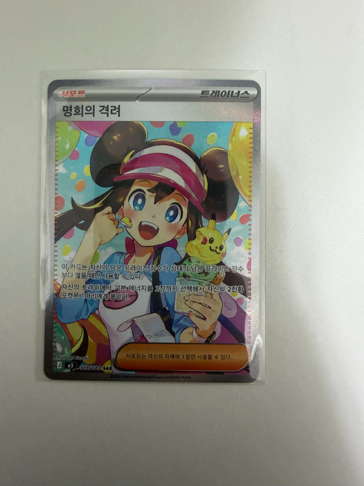 포켓몬카드 명희의 격려 판매해요! 상태 양호하고 포장도 잘 되어있어서 컬렉션용으로 좋을 것 같아요. 관심 있으시면 연락주세요~ 한정판 포켓몬카드 2장 세트로 레터링이 들어있어요. 카드 상태는 양호하고 보관용 케이스도 함께 드려요. 포켓몬 수집하시는 분께 추천합니다! 명희의 격려 SAR 100000원에 팝니다 뽑자마자 슬리브 탑로더 처리해서 상태 매우 좋습니다 센터링 매우 좋습니다