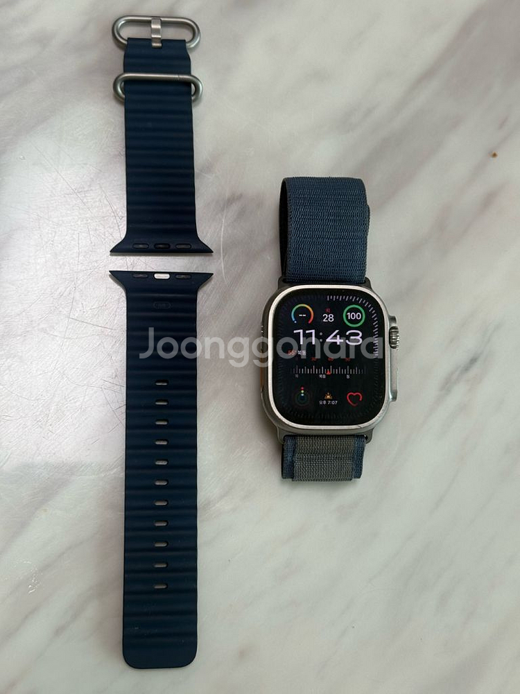 개인정보(거래정보)를 주고받는 행위는 사기에 노출될 수 있으므로 즉시 중고나라로 신고해 주세요애플워치 울트라 2 49mm 티타늄 모델 GPS+셀룰러 실리콘 오션스트랩+패브릭 스트랩 사진 속 구성품 모두 보내드려요 배터리 성능 99%