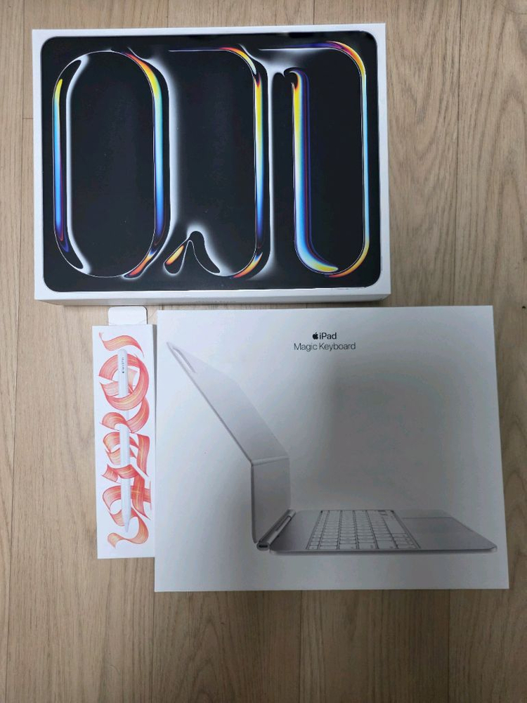 새 상품급 iPad Pro 13인치 M4 1TB Wi-Fi + Cellular 모델입니다. 매직키보드, 애플케어플러스, 애플펜슬 포함입니다. 가로수길 애플스토어에서 직접 구매했고 모든 구성 있는 풀박스입니다. 사시면 다른 거 살 필요없이 그냥 쓰시면 됩니다. 알콜솜으로 항상 관리하고 책상에서도 받침대를 항상 두고 써서 상태 좋다고 자부하고 애플케어플러스로 쓰시다가 교체도 가능합니다.