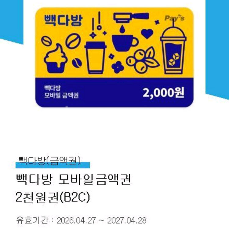 27.4.28 까지 사용가능 빽다방 모바일금액권 2천 ㅡ 1750 네고사절 환불불가