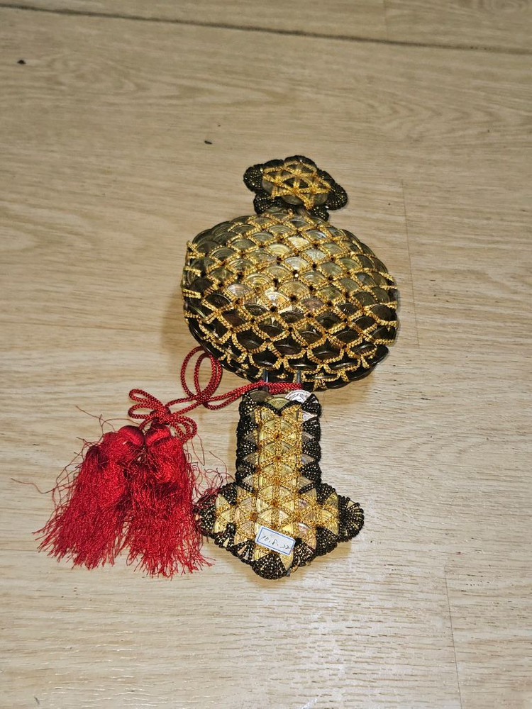 ㅡ이 유물은 **'일본 5엔 동전으로 만든 복(福)을 부르는 장식품'**입니다. 왜 5엔 동전인가?: 일본어에서 '5엔(五円, go-en)'은 **'인연(御縁, go-en)'**과 발음이 같습니다. 때문에 일본인들은 5엔 동전을 신사에 시주하거나 몸에 지니면 좋은 인연(사람, 일, 돈 모두 포함)이 생긴다고 믿는 강력한 부적입니다. ㅡ무엇을 나타내는가?: 상단의 둥근 부분은 **'술병(덕리, Tokkuri)'**이나 **'복주머니'**를 형상화한 것으로 보이며, 하단의 손잡이 모양은 **'망치(우치데노코즈치,Uchide-no-kozuchi)'**일 가능성이 높습니다. 망치는 일본 신화 속에서 휘두르면 원하는 물건이나 돈이 나오는 보물입니다. ㅡ종합적 의미: 즉, 이 물건은 **"좋은 인연(5엔)을 엮어 복주머니에 가득 담고, 보물 망치로 돈을 불러들인다"**는 아주 강력한 길상(좋은 징조)의 의미를 담고 있는 전통 공예품입니다. ㅡ제원: 전체 길이는 약 29cm, 술병 모양의 지름은 약 13.5cm입니다. 무게는 1,023g으로, 1kg이 넘는 실제 동전의 중량감을 가지고 있습니다. ㅡ소장 가치가 매우 높은, 진짜 일본 5엔(5円) 동전 수십 개를 정교하게 엮어 만든 전통 공예 장식품입니다. '가짜 엽전'이 아닙니다. 확대 사진에서 보시듯 실제 유통되는 일본 5엔 동전들을 사용했습니다. ㅡ특징: 진짜 동전으로 만들어 무게가 **1kg(1,023g)**이 넘을 정도로 묵직하며, 그만큼 존재감이 확실합니다. 금색 실과 검은색 실로 엮어낸 세공이 매우 정교하고 아름답습니다. 빨간색 고급 매듭 술(Tassel)이 달려있어 걸어두면 인테리어 소품으로도 훌륭합니다. ㅡ상태: 보존 상태 아주 좋습니다. 새해 선물, 개업 선물, 혹은 본인의 행운을 위해 소장하시기 바랍니다. ㅡ사이즈: 전체 세로 약 29cm / 술병 모양 지름 약 13.5cm 직접 확인해보시면 그 묵직함과 정교함에 놀라실 겁니다. 가치를 아시는 분의 연락 기다립니다. ㅡ무엇보다 이러한 형태의 정교한 동전 공예품은 일본 현지에서도 흔치 않은 희귀 수집품으로, 소장 가치가 높게 평가됩니다. ㅡ 감정가 25만원까지 나오지만은 싸게 내 놓습니다. [거래 안내] 본 가격은 우체국(또는 편의점/방문) 택배비가 포함된 금액입니다. 입금 확인 후, 정성껏 포장하여 신속하게 발송해 드리고 운송장 번호를 보내드립니다. 별도의 택배비 부담 없이 표시된 가격 그대로 거래 가능합니다. 소중히 수집해온 물건인 만큼 안전하게 전달해 드리겠습니다.