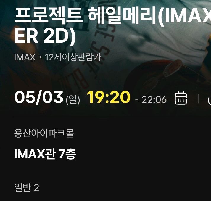 영화 : 프로젝트 헤일메리 극장 : 용아맥 cgv용산 아이맥스 시간 : 5/3 일요일 오후 19:20회차 자리 :사이드블럭 중앙복도 바로 옆 N열 2자리 문의 주시면 자리 보여드려요 빠른거래 가능해요. 예매내역보내드리면 극장가셔서 티켓발매기에서 지류티켓 발매 후 관람하시면 됩니다