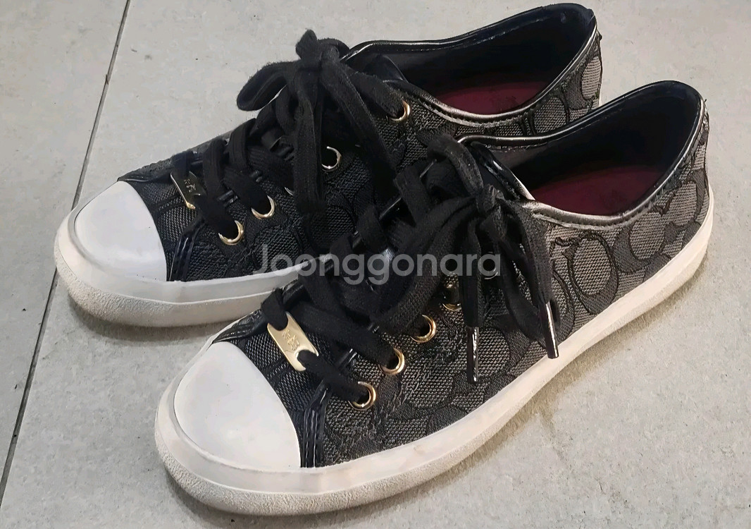 개인정보(거래정보)를 주고받는 행위는 사기에 노출될 수 있으므로 즉시 중고나라로 신고해 주세요시그니처 로고 패턴이 들어간 블랙 컬러 스니커즈예요. 화이트 솔과 골드 포인트가 세련된 느낌을 주는 제품입니다. 전체적으로 깔끔한 상태로 보관되어 있어요.