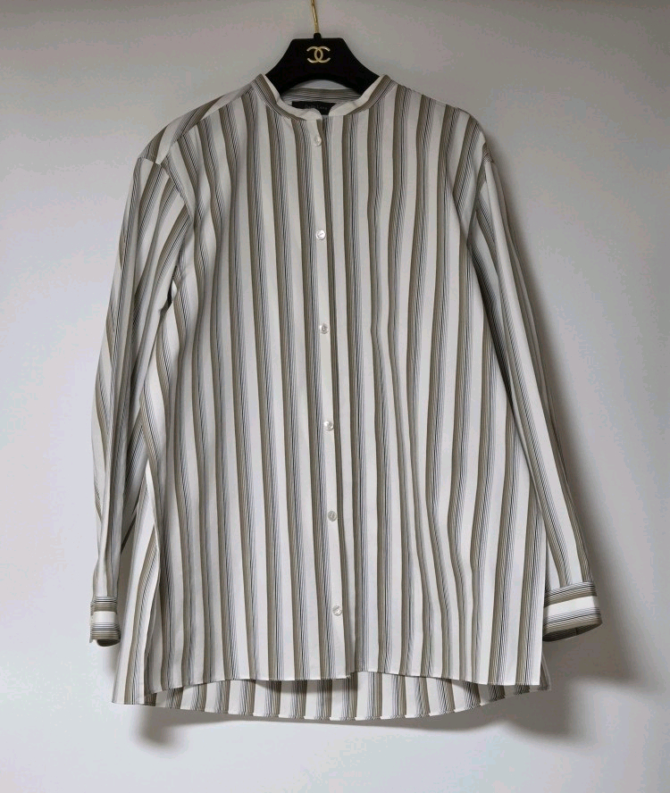 신세계인터내셔날 컨템포러리 브랜드 델라라나(DELLA LANA) 스트라이프 셔츠 택째 새제품 2020년 매장에서 5-60만원 대 구입 고급 이탈리아 소재로 면 100% 택 기재 55인데 아주 넉넉하게 나와 실측 가슴 반품 57, 기장 78cm 새 제품인데 드라이도 완료해서 바로 착용 가능 여벌 단추도 있음
