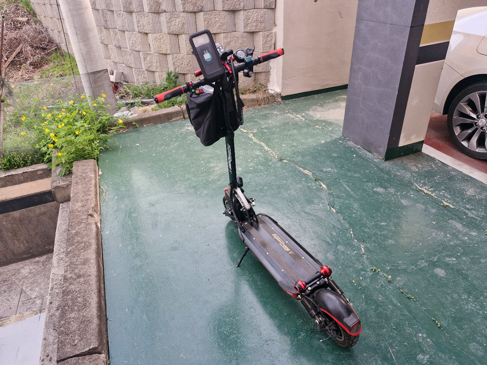 미니모터스 스피드웨이 V 전동 킥보드 블랙 색상입니다 60v 23.6ah 총키로수 26.04.25기준 1036.6km (출퇴근 시 타고 있어서 하루에 1-3km정도 늘어난다고 생각해 주시고 문의 주시면 문의 시 총키로수 알려드릴게요.) 키박스 + 키 2개 파박이(전면부 빨파? 깜빡거리는 라이트) 윌리바 + 포크슬라이더 확장바 핸들그립 머드가드 몰딩 휴대폰 거치대 상단 라이트 추가 핸들앞쪽 가방 10인치 오프로드 광폭타이어 장착중 일반충전기 같이 드리고 사용감 좀 있고 핸들 양쪽에 찍힘 살짝있어요. 속도감 좋고 오르막도 전혀 문제 없습니다. 최대하중도 넉넉해서 속도에 영향 주지 않습니다. 궁금한건 문자주세요. 기본제품 영문 사용설명서 pdf파일 같이 드려요. 택배거래는 어렵습니다. 와서 가져가실분만
