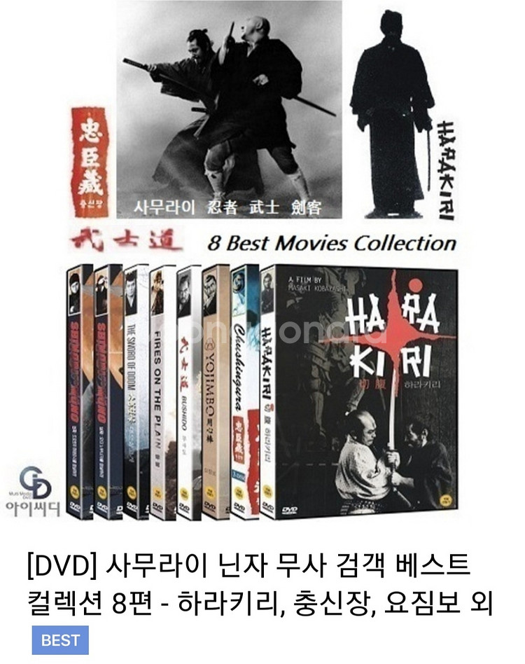 [DVD] 사무라이, 닌자, 무사, 검객, 베스트 컬렉션 8편 - 닌자 도요토미 히데요시를 암살하라 +닌자 오다 노부나가를 암살하라 + 대보살 고개 + 들불 + 무사도 + 요짐보 + 충신장 + 하라키리 (미개봉ㆍ각 개별 포장) 1. 닌자 : 도요토미 히데요시를 암살하라 (Zoku Shinobi no Mono, 1963) 감독 : 야마모토 사츠오 출연 : 후지무라 시호, 다테 사부로, 이치가와 라이조 2. 닌자 : 오다 노부나가를 암살하라 (Shinobi no Mono, 1962) 감독 : 야마모토 사츠오 출연 : 이치카와 푸지무라 시호 3. 대보살 고개 (The Sword Of Doom) 감독 : 오카모토 키하치 출연 : 나카다이 타츠야 4. 들불 (Fires On The Plain) 감독 : 이치카와 곤 (Kon Ichikawa,市川崑) 5. 무사도 (제13회 베를린 영화제 금곰상) 감독 : 이마이 타다시 출연 : 나카무라 키노스케 6. 요짐보 (Yojimbo, 베니스영화제 남우주연상) 감독 : 구로사와 아키라 출연 : 미후네 도시로, 후지와라 카마타리, 에지로 토노 7. 충신장 - 47인의 자객 3Disc 감독 : 이나가키 히로시 출연 : 마츠모토 코시로 8. 하라키리 (Harakiri 제 16회 칸느 심사위원 대상 수상작)