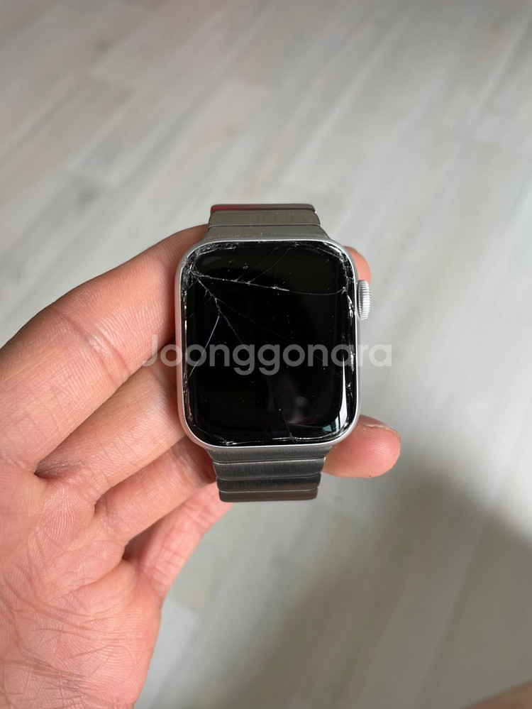 애플워치6 40mm 실버 알루미늄 GPS 제품입니다. 보시다시피 떨어뜨려서 액정이 깨졌고, 사진 보시면 왼쪽 상단 면에 파임도 살짝 생겼습니다. 애케플도 없어서 그대로 판매합니다. 자가수리해서 쓰실 분이나 부품용으로 쓰실 분이 사가시면 될 것 같습니다. 액정 외에는 아무 문제 없습니다. 터치는 문제없이 잘 되고 원하시면 인증 영상 보내드립니다. 무상 보증은 만료된 상태고 배터리 효율은 사진에 있다시피 92퍼입니다. 살 때 풀박스 그대로 갖고 있어서 박스 + 기본 흰색 스포츠 스트랩까지 그대로 드립니다. 사진에 있는 제가 쓰던 링크브레이슬릿 스트랩(시중 5만원 정도 하는 URVOI 제품입니다)도 같이 드립니다. 직거래는 천안입니다.