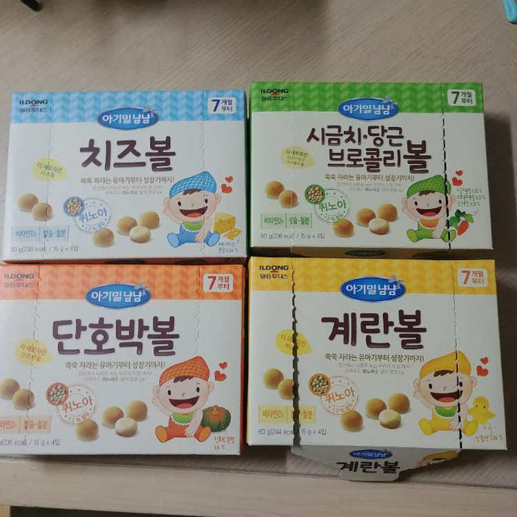 아기가 별루안좋아해서 내놓습니다 계란볼과 시금치볼은 한봉씩먹었습니다 4봉중 3봉씩 남았네요 치즈볼과 단호박볼은 새거입니다 구입은 9월초에 구입했습니다 다해서 택포5000원입니다