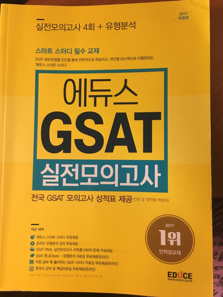 2017하반기 gsat 에듀스 책 판매합니다 실전모의고사1회 언어,자료해석 파트만 풀었어요! 다른부분은 건들지도 않은 새책입니다! 하반기준비때 필요하신분 연락주셔요