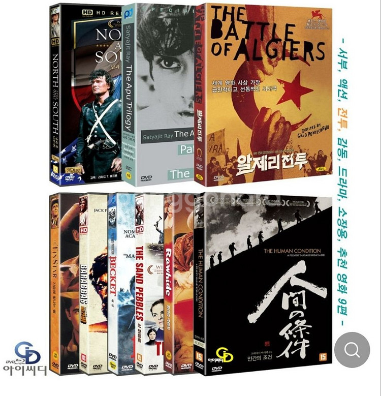 [DVD] 서부 액션 전투 감동 드라마 소장용 추천 영화 9편 - 남과 북 3부작 + 아푸 3부작 (디지팩) + 알제리 전투 (디지팩) +인간의 조건 + 가슴에 빛나는 별 + 바라바 + 베켓 + 산 파블로 + 황야의 역마차 < 미개봉, 각 개별 포장>