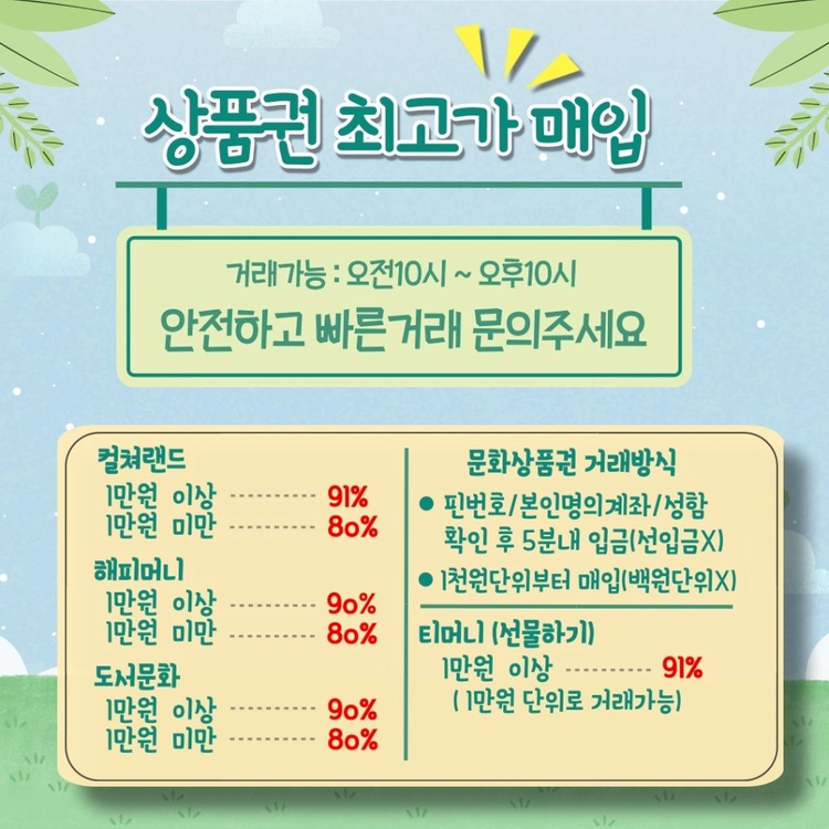 ★컬쳐랜드 →1만원이상 91% →1만원미만 80% ★해피머니 / 도서문화 →1만원이상 90% →1만원미만 80% ★티머니 91%, 롯데모바일 92% ★백화점 모바일 상품권 *신세계[이마트겸용] / 롯데백화점 →10만원 이상 : 95% →10만원 미만 : 90% *현대백화점 →10만원 이상 : 94% →10만원 미만 : 90% *홈플러스(금액권X) →10만원 이상 : 91% →10만원 미만 : 89% ★신세계[백화점전용]★ →금액무관 : 91% →월~토 오후 2시까지 매입 가능, 확인 및 입금은 오후 3시 가능 ★각종 지류 5만원권이상 -SK/GS/현대/S-oil 주유권 96% -신세계 / 롯데 95% -현대 94% -국민관광상품권 94% -삼성 / 갤러리아 93% -홈플러스 91% (1만원권, 3만원권 89%) -금강제화 68% *1만원권, 3만원권 91% ※증정,사은품※ -1만원권 75%, 3만원권부터 85% ★지류상품권은 직접 방문하여 거래 하시거나 등기로 보내주시는 방법으로 거래가능하십니다