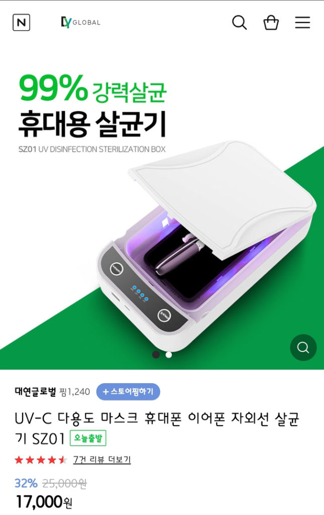 미사용입니다. UV-C 다용도 자외선 살균기 SZ01 마스크 휴대폰 이어폰 살균 가능합니다.