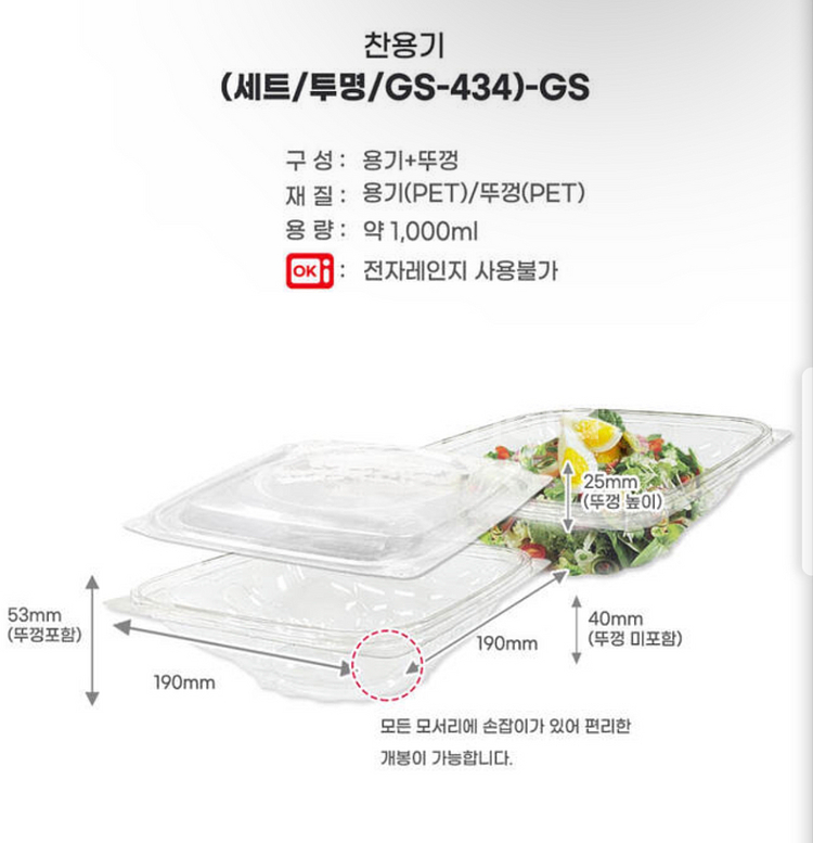 제품명 : 반찬/샐러드용기세트 (GS-434) 재질 : PET 크기 : 190*190*53mm (1000ml) 제조국명 : 대한민국 개수 : 250개 * 픽업은 마포구 망원에서 가능하시며, 택배 발송 시 착불로 가능합니다 *