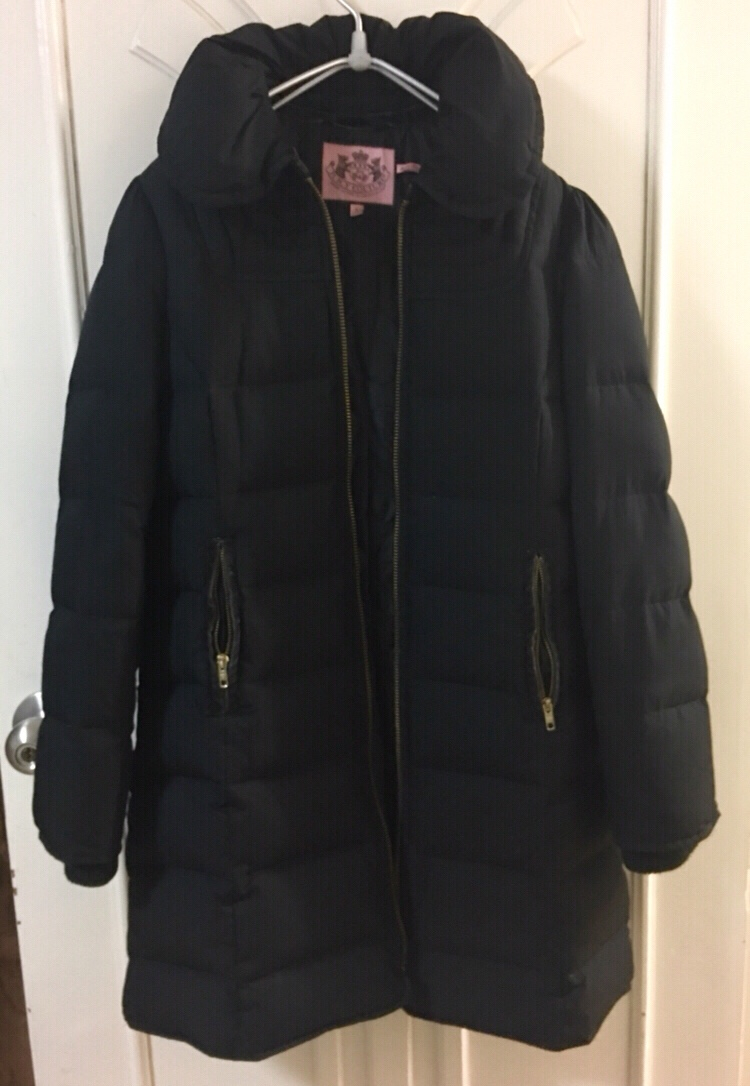 쥬시 꾸뛰르 오리털 패딩입니다. 착용시 보온감이 매우 좋고 착용감이 좋습니다. 오른쪽 주머니 지퍼 부분이 고장나 지퍼가 올라가지 않으며 벨벳 테두리 부분이 살짝 바래어 있습니다. 그외에는 약간의 사용감은 있으나 깨끗합니다. 교환. 환불. 반품이 불가하니 신중한 구매 부탁드립니다.