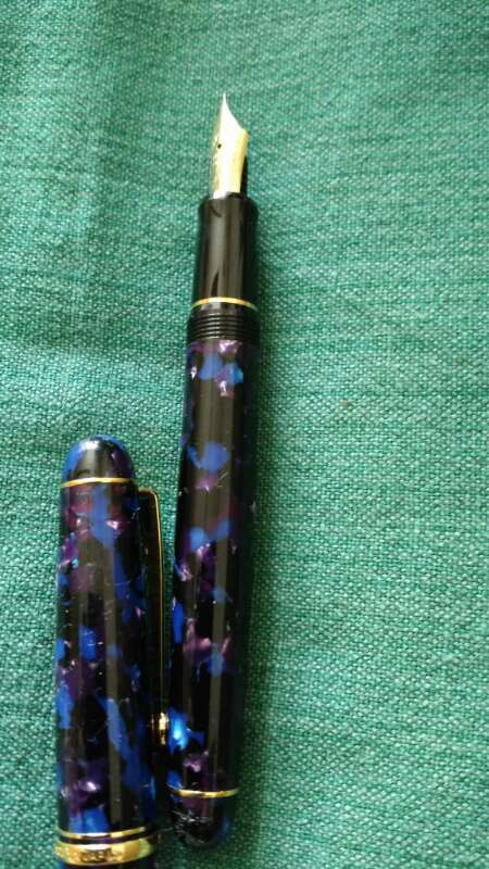빛나는 자개문양의 고급 굵은 만년필입니다. 잉크시험만하고 쓰지않은 미사용제품입니다.