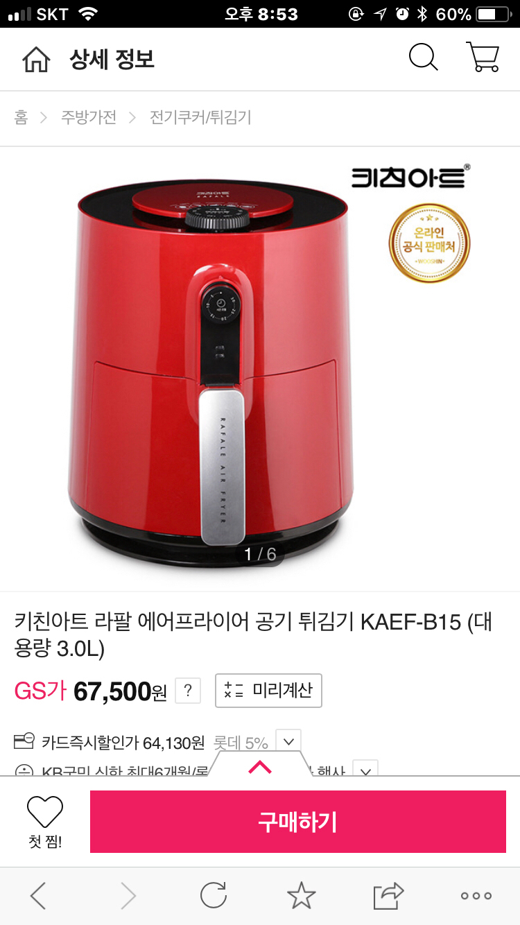 개인정보(거래정보)를 주고받는 행위는 사기에 노출될 수 있으므로 즉시 중고나라로 신고해 주세요키친아트 에어프라이어 판매해요 산지 2달 정도 된 것 같구, 실사용 5번 했어요 어무니가 살림 이것저것 있는걸 별로 안좋아하셔서, 내놔요~ 박스는 없습니당 직거래 수원 영통이구요. 댓글 주심 연락처 드릴께요~