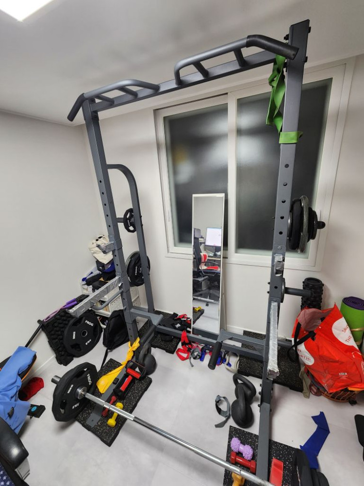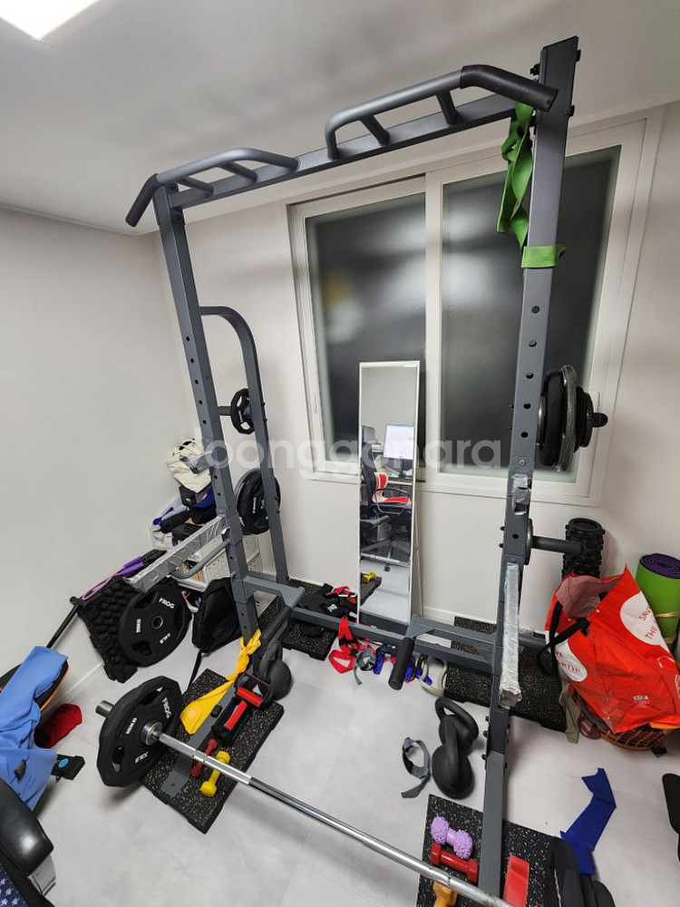 2년 정도 쓴 하프랙입니다 사실 사용감은 꽤 많습니다 하프랙만 팝니다 서울 신도림역 구로역 인근에 거주합니다 이 제품은 이런 분께 추천합니다 1.비교적 적은 공간에 하프랙을 설치하시려는 분 2.프리웨이트 위주로 중량 좀 치시는 분들 (원판 거치대가 총 6개 , 3쌍 입니다) 3. 딥스 턱걸이 다 있구요 턱걸이 그립도 다양합니다 직거래로 9.5만원에 팝니다